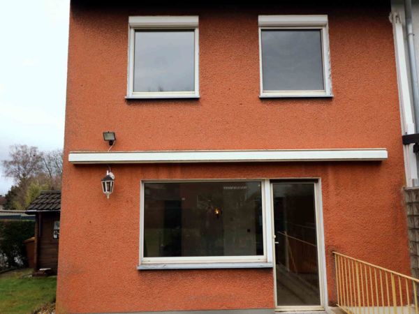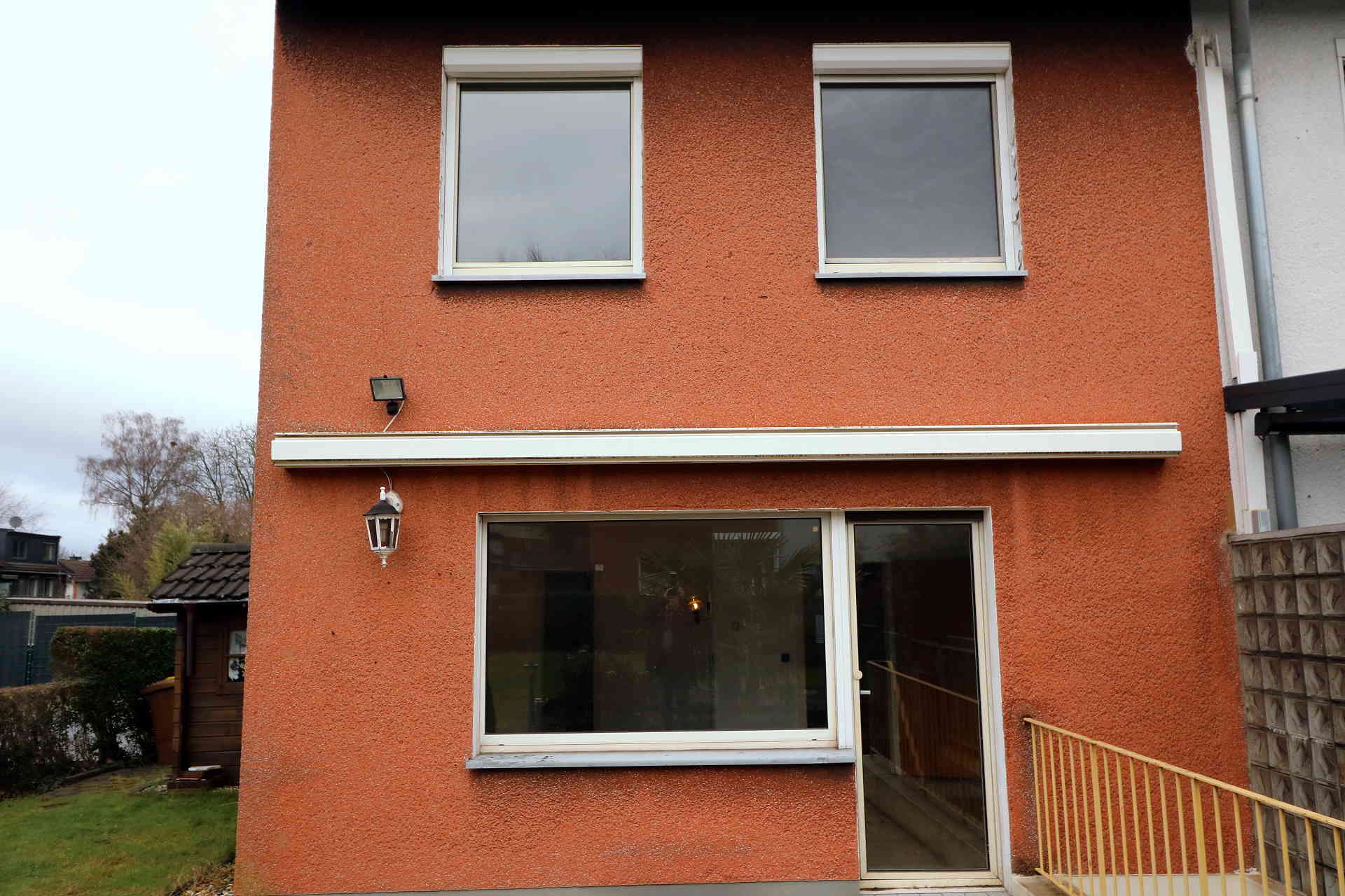 Ein schmaler Teil rechts vom Fenster des Gäste- oder Kinderzimmers wurde dem benachbarten Badezimmer hinzugefügt, um das Bad zu vergrößern. Die ursprüngliche Wand wurde entfernt und durch eine Trockenbauwand ersetzt.